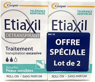 ETIAXIL Etiaxil Rouleau de 2 pièces pour peaux normaux 15 ml Visiter la boutique Etiaxil 39 évaluations 2290€ (76,33€ /100 ml) Tous les prix incluent la TVA. À propos de cet article Etiaxil - Traitement anti-transpirant pour les bras et les peaux normales - 15 ml - Lot de 2 pièces Nous avons une surprise pour vous ETIAXIL DETRANSPIRANT LOT DE 2 BILLE PEAUX SENSIBLES Marque : Cooper 157 évaluations | 3 questions avec réponses 2900€ (966,67€ / l) Tous les prix incluent la TVA. Article similaire à considérer Marque Amazon - Solimo Anti-transpirante à bille, soin douceur, parfum rose, Lot de 6 (6x50ml) 50 ml (Lot de 6) (401) EUR 12,09 (4,03 €/100 ml)