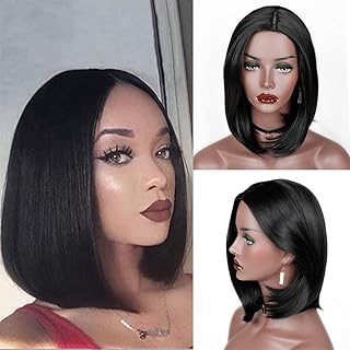 Ruiyu cheveux 14 pouces court Bob perruque pour les femmes naturel noir partie centrale résistant à la chaleur droite synthétique perruque 150% densité cheveux synthétiques pleine perruques (Black)
