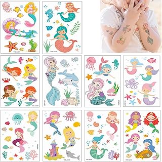 Feelairy Tatouages Temporaires de Sirène Tatoo, 140 pièces Princesse Tatouages Ephémères Autocollants pour Filles Enfants Cadeau d'anniversaire Sacs Cadeaux Sirène Décoration de Fête (10 Feuilles)