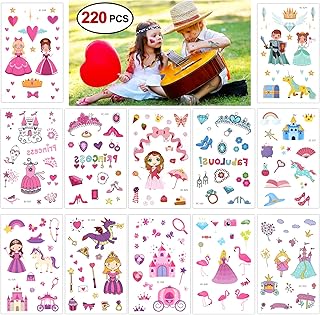 Konsait 220 Tatouages temporaires de Princesse - Licorne Château Princesse Reine Tatouages ephémères Tattoo Autocollant pour Filles Enfants d'anniversaire Cadeaux Pinata
