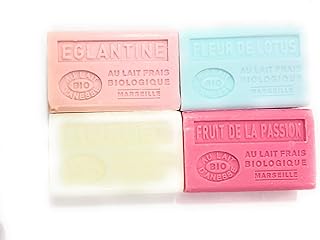 Label Provence, Lot de 4 savons de Marseille au lait d’ânesse bio - Parfum muguet églantine,fruit de la passion et fleur de lotus-4x125g-Fabriqués à Marseille-